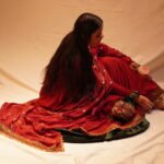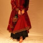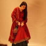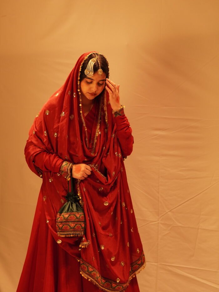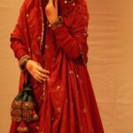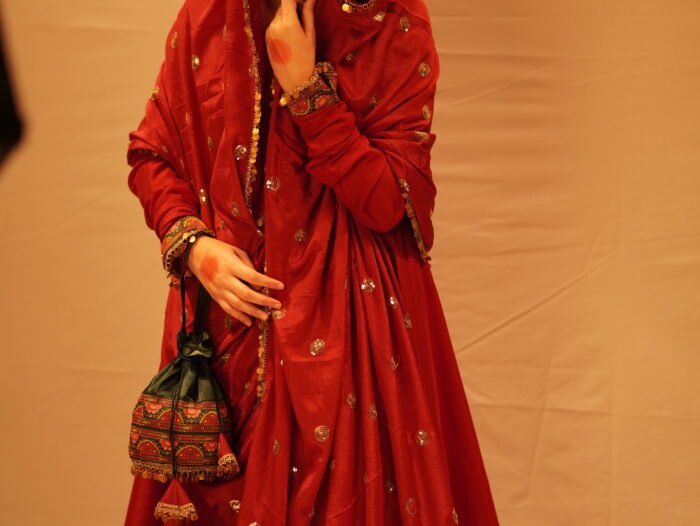 Inside, the Anarkali is paired with a thick satin lehenga that provides structure, volume, and a smooth fall. The set is completed with an embroidered sequin-work dupatta and a matching embroidered potli.